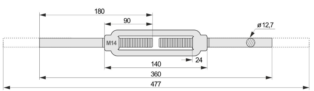 M14 névleges méretű horganyzott kötélfeszítő hegeszthető végződésekkel DIN 1480 szerint.