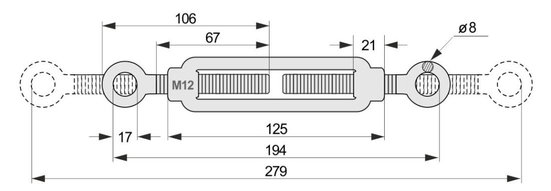 M12 névleges méretű horganyzott kötélfeszítő szemes-szemes kialakítással DIN 1480 szerint.